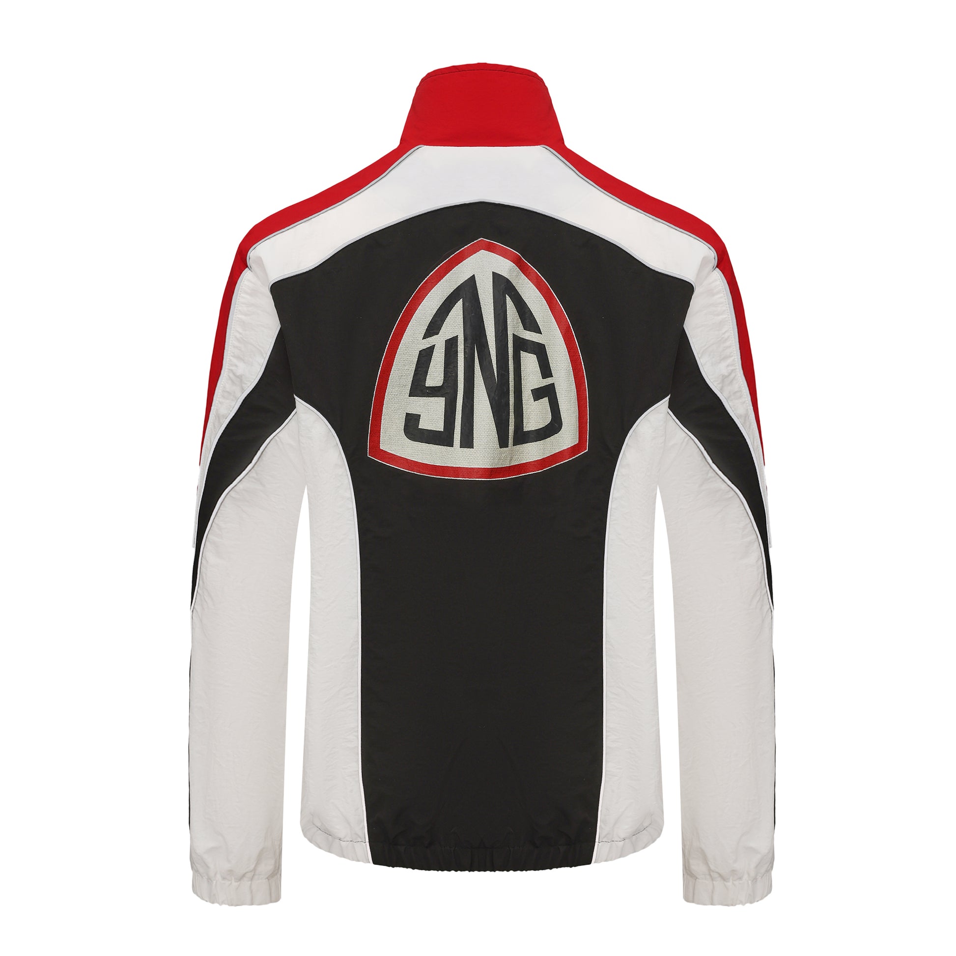 The dynamic color-blocked paneling in black, white, and racing red creates a sculpted athletic profile, while the high-collar design and full-zip closure offer functional versatility. A minimal YNG Athletic Performance mark sits at the chest, balanced by the bold oversized YNG crest across the back — a commanding statement of identity and movement.